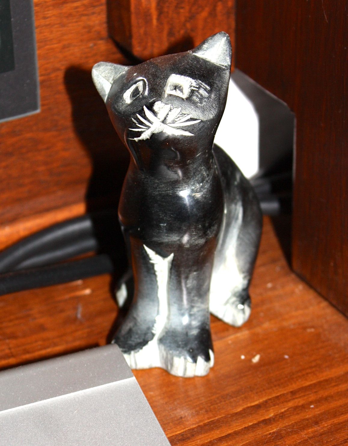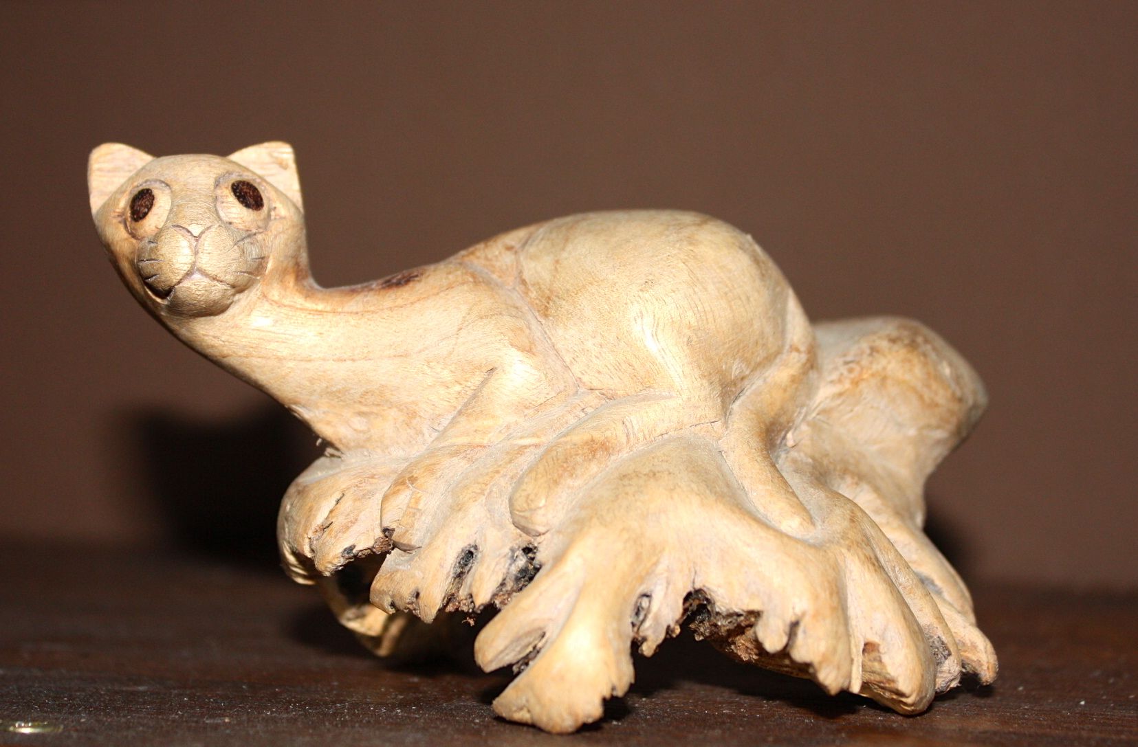 Die Wurzelkatze. Sie war die erste, die irgendwann mal ihren Weg zu uns fand. Sie ist aus einer Wurzel oder einem Holz oder aus wasweissichnicht gemacht und guckt irgendwie ängstlich. Ich finde sie jetzt nicht wirklich schön in dem Sinne – aber alleine durch ihr Material hat sie was. Ja, und Staub müßte hier auch mal wieder gewischt werden, ich weiss.