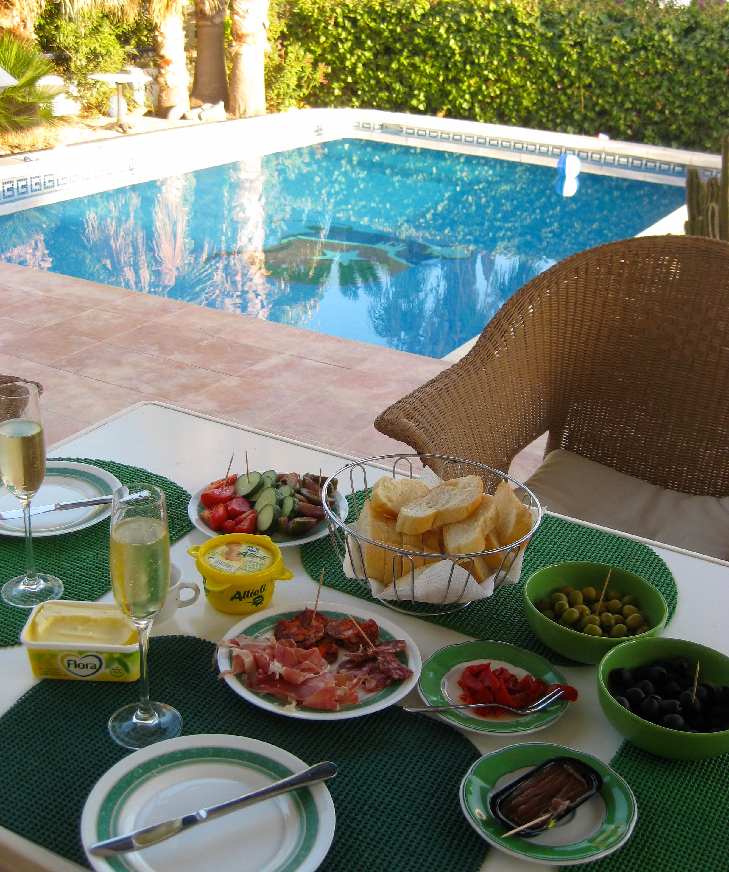 Ich habe ja das große Glück einen Vater mit Haus in Spanien zu haben, in dem ich gerade mit Kind Nummer Zwei nebst Serienjunkiefrau und -kind weile. Und wenn man ab und an dahin fährt, dann hat man so seine Rituale. Eines ist sofort nach dem Ankommen am Pool ein Glas Sekt zu trinken. Ein anderes: Den ersten Abend gibt es meine Version von Tapas. Immer.