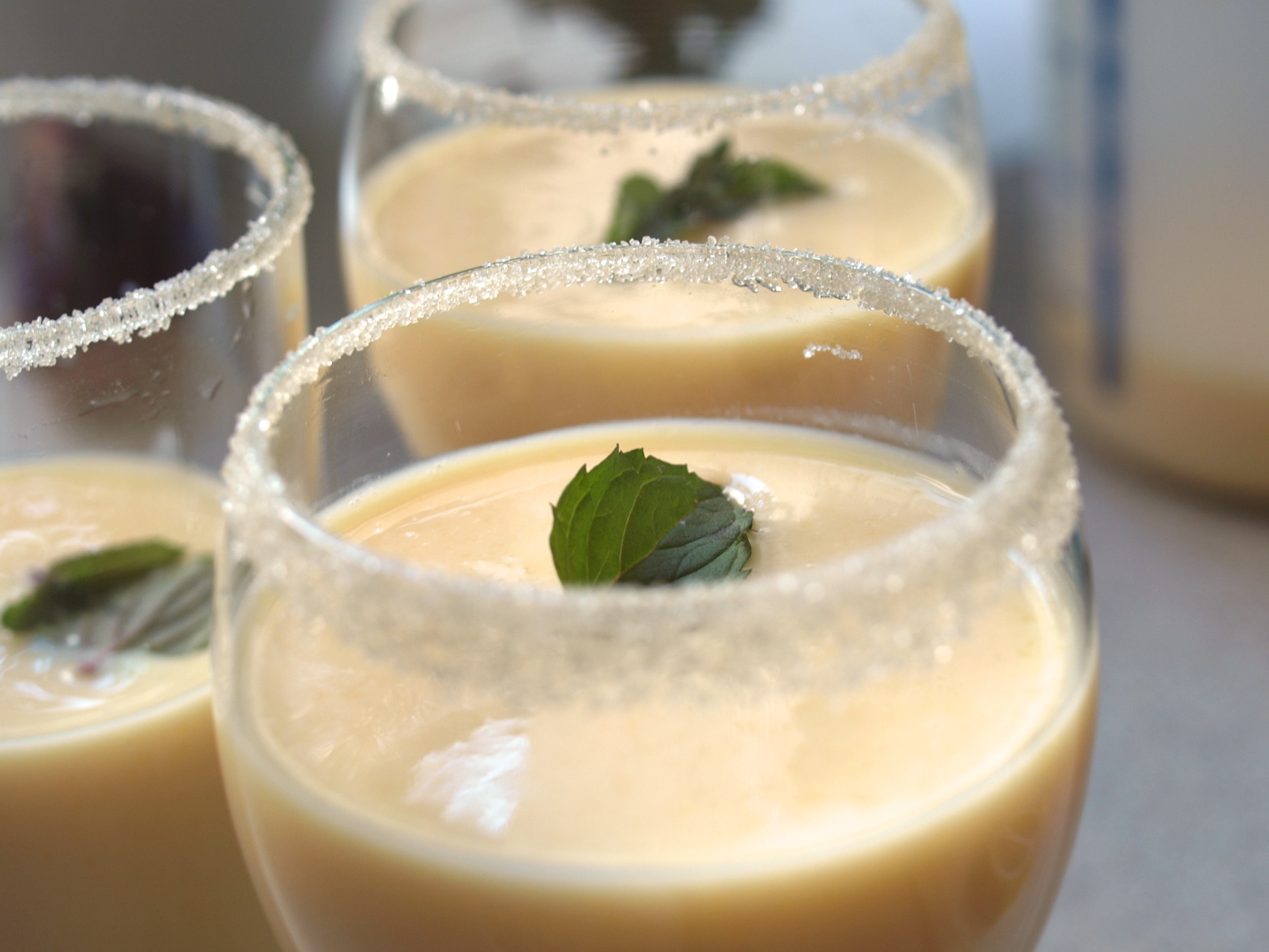 Die Ränder der Gläser mit einem Zitronenschnitz einreiben, in Zucker tauchen. Vorsichtig eingießen, damit der Rand nicht kaputt geht. Minze oder Zitronenmelisse als Gründekoration. Lecker.