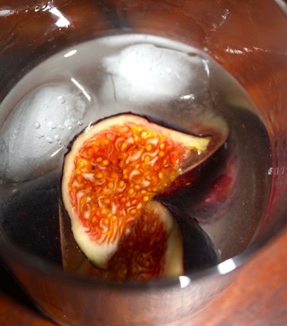 Man nehme eine Feige, nicht zu weich und wasche vorsichtig die Schale mit warmem Wasser ab. Dann achtele man sie und gibt die Hälfte davon in ein Glas mit Eiswürfeln (kann man weglassen, wenn man meint es verwässert den Alk zu sehr, aber erstens war der Wodka nicht kalt und zweitens mag ich sowas nur richtig runtergekühlt). Darüber gibt man den gewünschte Menge Wodka – ich habe langsam angefangen und erstnal nur soviel ins Glas gegossen, bis die Feige bedeckt war.