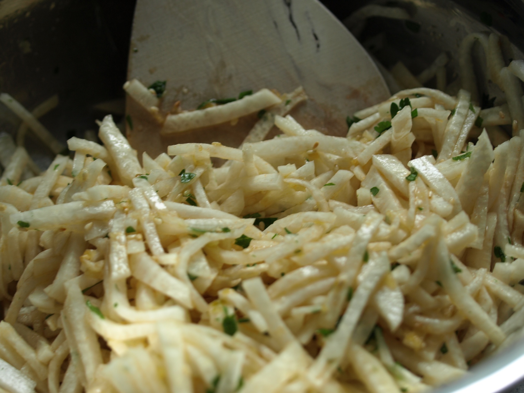 Einen weißen Rettich in feine Stifte zerlegen. Mit dem Saft von zwei Zitronen mischen, dazu kommt ein Teelöffel feingehackte Petersilie und zwei durchgepresste Knoblauchzehen. Zum Abschluss einen halben Teelöffel Salz, zwei Teelöffel Zucker und einen Esslöffel Chilipaste dazugeben. Gut mischen, fertig.
