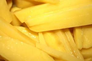Das hat man nun davon, wenn man Kinder dazu erzieht, selbst auf anständiges Essen zu achten. Meine letzten Versuche, Kartoffelstäbchen selbst zu stifteln und zu frittieren waren nicht wirklich von Erfolg gekrönt. Diesmal sollte es also der Backofen sein, den man bei Umluft auf 180°C Grad aufheizt. Sagte die selbstpommeszaubernde Freundinnen-Mutter.