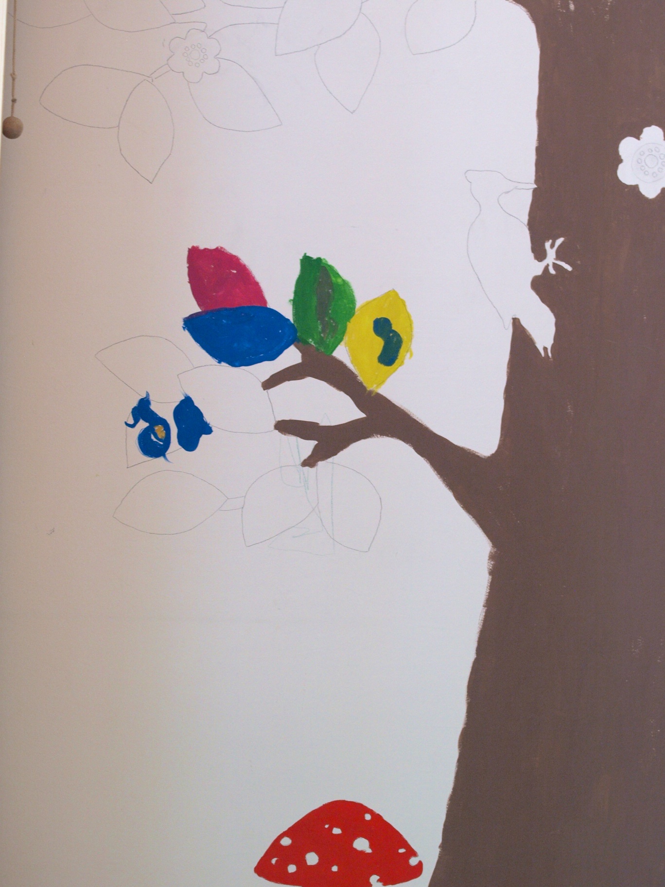 Wir bleiben bei den Wänden: Da gibt es im Kinderzimmer auch noch eine Baustelle. Vor Jahren wünschte sich mein Kind einen „Wald im Zimmer“. Unsere anfängliche Verwirrung (wieviel Bäume pro Quadratmeter? Nadel oder Laub?) konnte sie aufklären, sie woll gerne einen Wald an die Wand gemalt haben. Ihren künstlerisch herausgeforderten Eltern gelang es, sie auf einen Baum herunter zu handeln. Hoffnungsvoll haben wir angefangen, und irgendwann angebrochen. Jetzt müssen wir klären, ob sie das Ding noch fertig gepinselt haben will, oder ob wir lieber die ganze Wand einfarbig streichen sollen. In welcher Farbe auch immer.