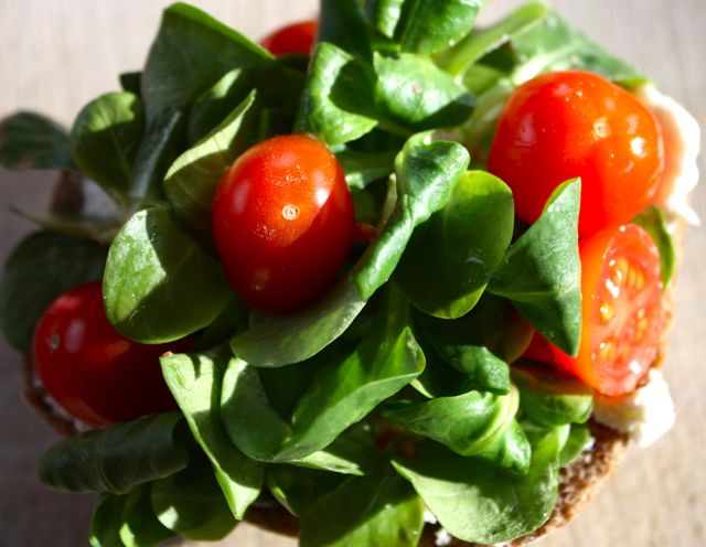 Auf eine getoastete Scheibe Vollkornbrot kommt reichlich Chili-Frischkäse. Darauf kommt dann mindestens ebenso reichlich Feldsalat und darauf wiederum halbierte Kirschtomaten. Zugegeben, leicht zu essen ist das nicht, aber man hat wenigstens die Illusion von Sonne im Mund.