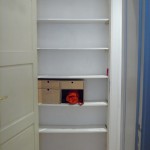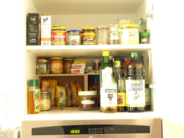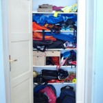 Bei den Zwillingen im Küchenschrank: Hier war der Gewürzschrank ob sei Tiefe sehr unübersichtlich geworden. Vorläufig konnten wir das Problem, nach gründlichem Ausmisten, dadurch abmildern, dass wir zwei kleine Kisten hinten in das untere Fach gestellt haben. Darauf finden jede Menge Gläschen und Döschen Platz, die jetzt zwar hinten stehen, aber immer noch von vorne zu sehen sind. Für das obere Fach fehlt noch eine Idee.- Bei der geplanten Reorganisation der Schränke: Da war als erstes der bislang stiefmütterlich behandelte Flurschrank dran. Ursprünglich handelt es sich dabei um eine blinde Tür; der Schrank ist daher nicht sehr tief. Und hat bis jetzt einfach nur „Kram“ geschluckt, ohne eine wirkliche Funktion zu haben. Beim Ausmisten wurde festgestellt, dass vieles davon höchstens dreimal im Jahr gebraucht, und eigentlich nie in der Wohnung (Strandspielzeug, Schwimmwesten, Kühltasche, Tischtennisschläger). All dies wird deshalb jetzt im Keller verschwinden. Vom Rest konnte einiges direkt in die Aussortier-Kiste, und nur wenige Teile wurden anderweitig untergebracht. Ergebnis siehe unten. Mir schwebt vor, hier einen Wäscheschrank einzurichten, fraglich ist nur, ob die Tiefe auf Dauer reicht.