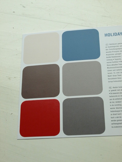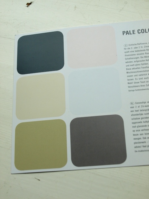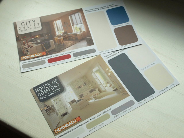 Um überhaupt mal ein paar ideen zu finden, über die man dann nachdenken kann, haben wir den nächsten Baumarkt überfallen. Anscheinend stehen wir mit unserer Ratlosigkeit nicht allein, denn sonst hätte man sich dort vermutlich nicht die Mühe mit dne Farbtafeln gemacht, auf denen man sich jeden mischbaren Ton heraussuchen kann. Und weil man dem Farbgeschmack der Kund noch ein wenig auf die Sprünge helfen will, gibt es schicke Kärtchen, auf denen zueinander passende Farbtöne zusammengestellt sind. Semi-individuelle Farbharmonie, sozusagen. Vermutlich sollen die Karten auch auch nur dafür sorgen, dass die Jungs an der Farbmischmaschine auch was zu tun haben. Weil alleingelassen würden farblich herausgeforderte Menschen wie ich am Ende nur wieder alles weiß streichen.