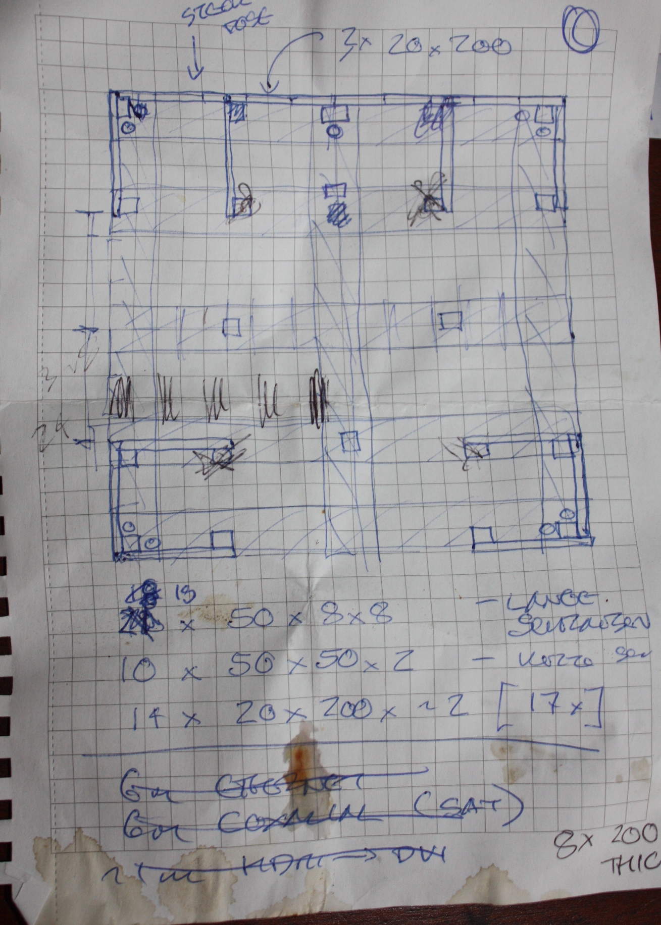 Der ursprüngliche Bauplan des Schäbigen Bettes. Die Höhe ist noch auf 50 cm veranschlagt und auch einige andere Maße sind später geändert worden. Die Flecken kommen daher, dass der Zettel zwischendurch in den Hausmüll landete, warum auch immer. Leider habe ich das erst gemerkt, nachdem ich das Altpapier durchsucht hatte.