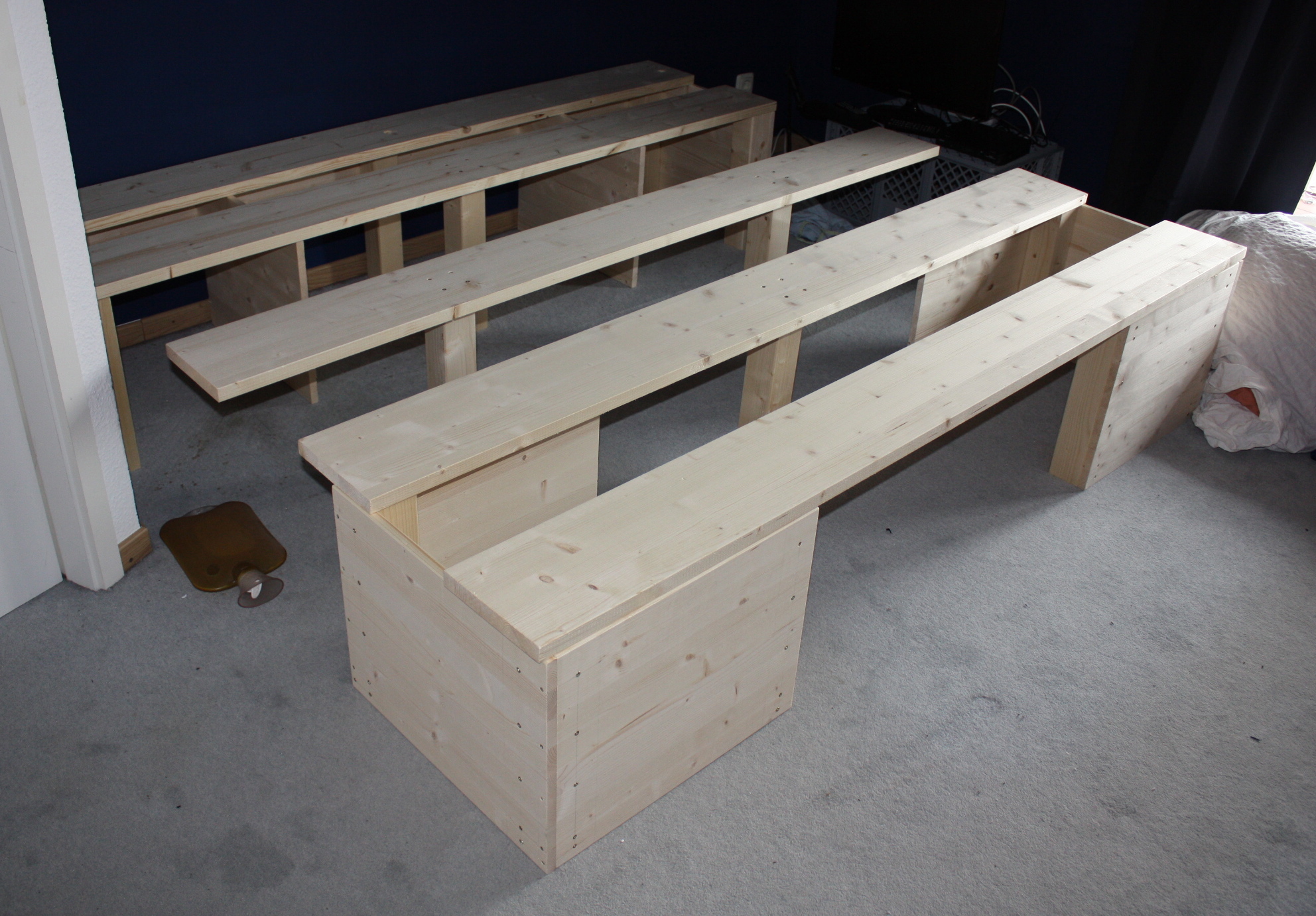 Klingt alles einfach, schon allein weil wir nichts mehr zuschneiden müssen. Das erste Problem war ohnehin ein anderes: Das Schlafzimmer liegt im ersten Stock, der Werkraum im Keller. Daher muss das Bett in kleineren Modulen gebaut und gestrichen werden, bevor es hoch getragen wird. Ich werde zu alt für sowas.