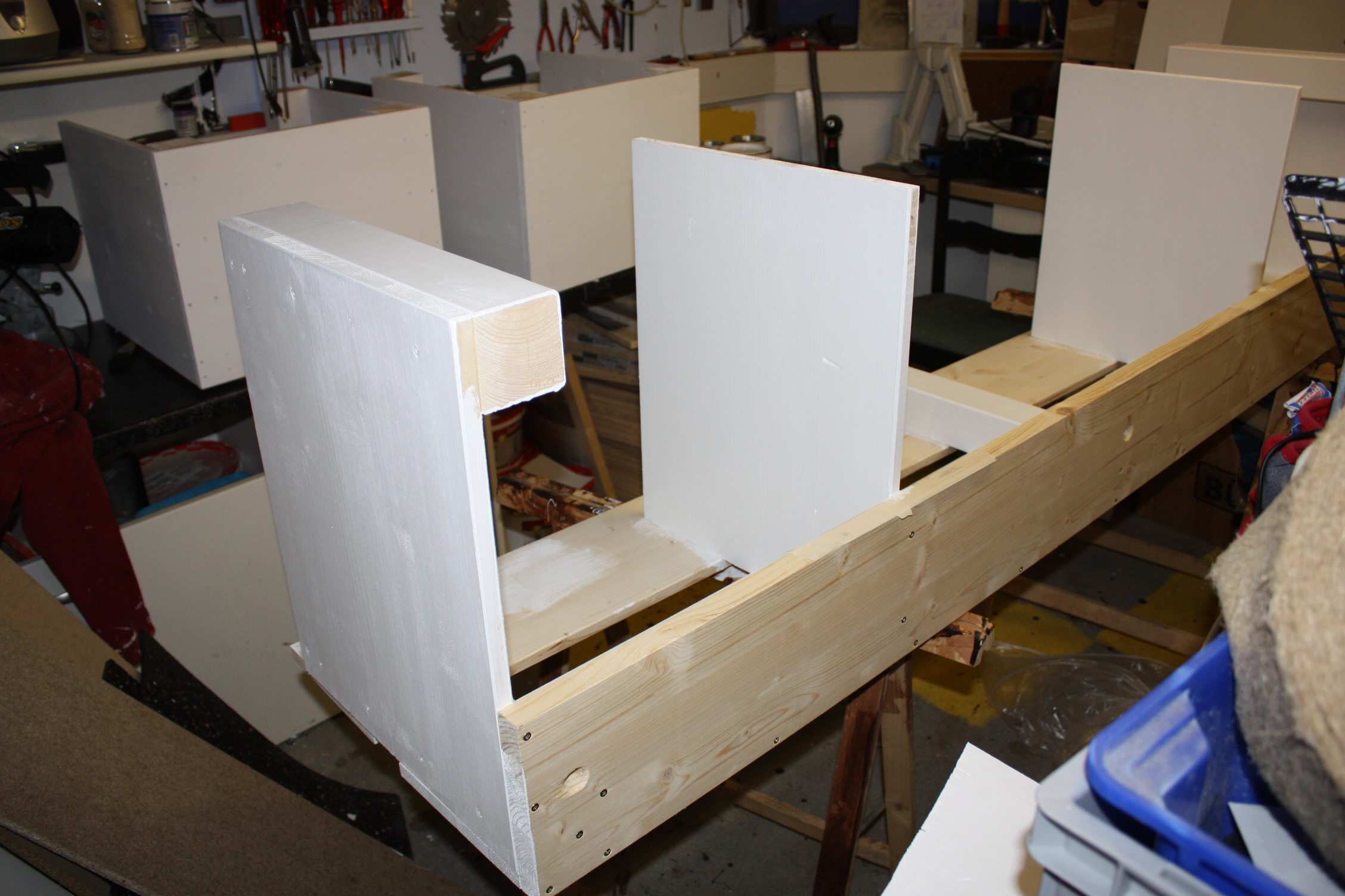Das größte Einzelmodul, das Kopfteil. Hier sieht man, was mit den „Quaderfüßen“ gemeint ist. Im Hintergrund die Quader für das Fußende. Ist das schäbig genug?