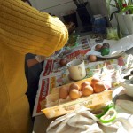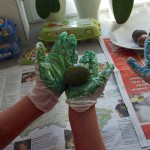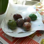 Am Sonntag waren Frau Stevensons Kinder und meine bei Birgit Frank zum Ostereierfärben eingeladen. Nachdem ich vor zwei Jahren den Versuch unternommen hatte, mich auf natürliche Eierfarben zu beschränken und das als mühsam und nicht wirklich ergiebig empfunden hatte, kam mir die Einladung gerade recht. Ein Kelch, der an mir vorbei geht. Da Brigit an die Angelegenheit jedoch weniger dogmatisch als vielmehr pragmatisch rangeht, war von mühsam keine Rede. Arbeitsfläche abdecken, Kinderhände in Gummihandschuhe verpacken und schon kann es losgehen. Ein paar Tropfen der Wunschfarbe aus der Packung auf die Hand, das frisch gekochte Ei dazu und verteilen. Dann trocknen lassen, danach noch eine Runde (oder zwei oder drei, je nach Farbvorstellung). Am Ende kam aus der Eierfärbepackung „Muschelglanz“ noch eine Art Siberfinish dazu, und das Ergebnis sieht einfach edel aus.