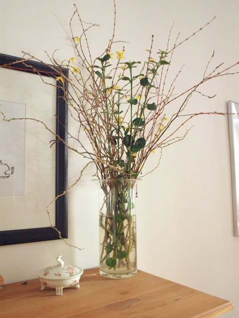 Der Strauß war nämlich Teil einer Tischdekoration. Unser Chor gab letztes Wochenende ein Konzert, mit Mitbring-Buffet und Bar etc. Bei der Vorbereitung kam die Frage auf, ob man den Buffettisch noch irgendwie dekorieren sollte. Kerzen scheiden da aus meiner Sicht aus, weil man darüber hantiert. Und an Blüten ist im Garten eigentlich noch nichts los. Efeuzweige waren angedacht. Dann aber kam eine Mitsängerin mit die Zweigbündeln. Gemischte Äste aus dem Garten, alle mit frischen Knopsen, bisschen Forsythie, bisschen Korkenzieherhasel und noch so allerlei. Alle auf gleiche Länge genschitten und locker mit bunten Bändern umwickelt. Die Bündel haben wir zwischen die Schüsseln und auf den Fensterbänken platziert und es sah einfach nur gut aus. Kein Foto, leider, hier ist jetzt mal Vorstellungskraft gefragt. Das beste aber kam zum Schluss. Da wurden wir angewiesen, die Bündel bitte auf jeden Fall mitzunehmen und gleich ins Wasser zu stellen, weil frisch geschnitten. Da steht er jetzt, der Strauß, und grünt und blüht. Und ich hab einmal ein bisschen Vorsprung vor dem Hasen.