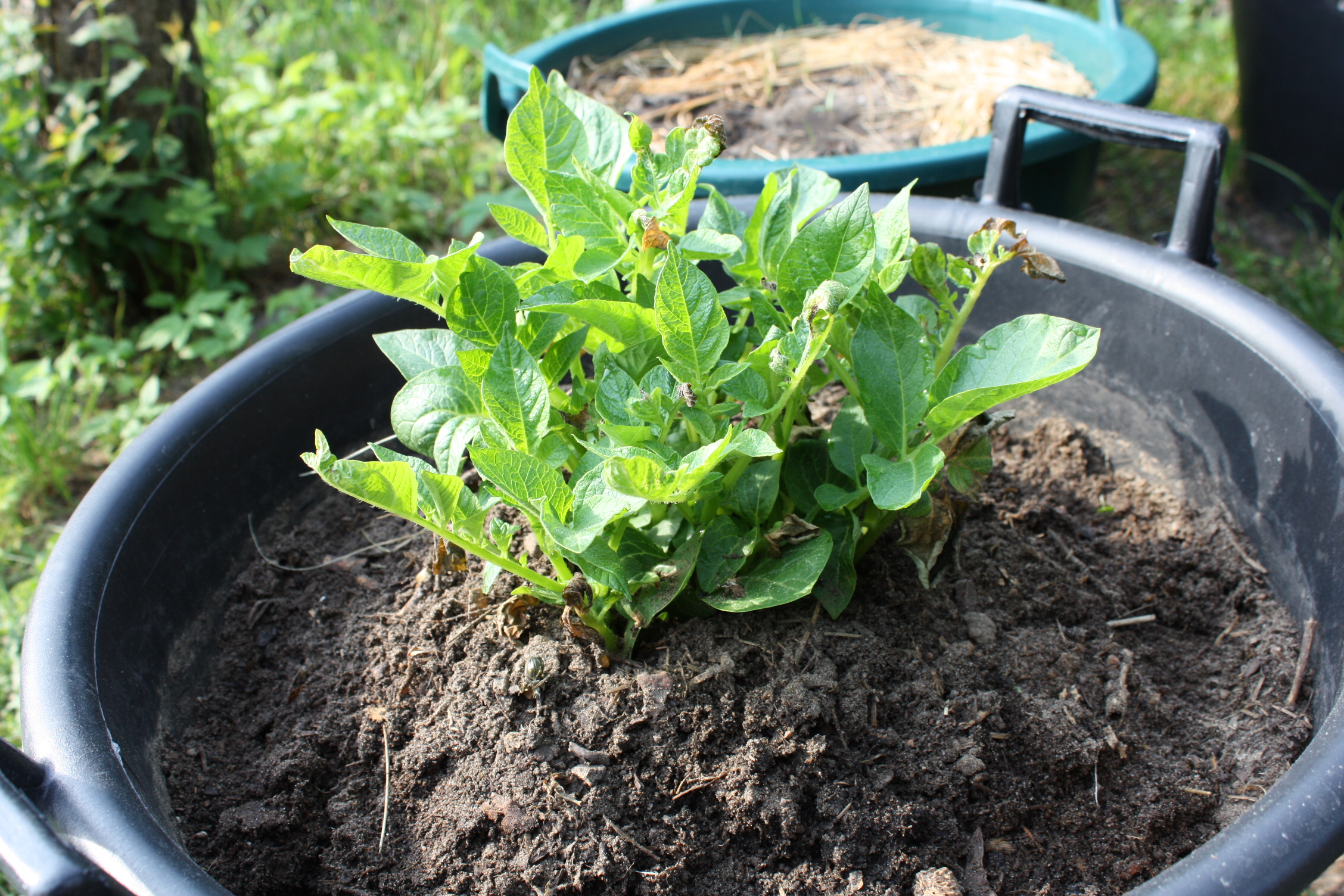 Kartoffel in Eimer. Um wenigstens etwas aufhäufen zu können, muss man die Erde am Anfang hoch auf den Seiten auftürmen.