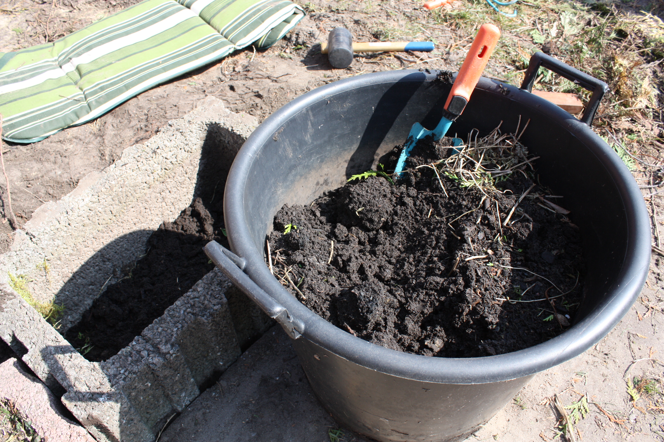 Dunkle, lockere und gut riechende Erde aus einem der Eimer.