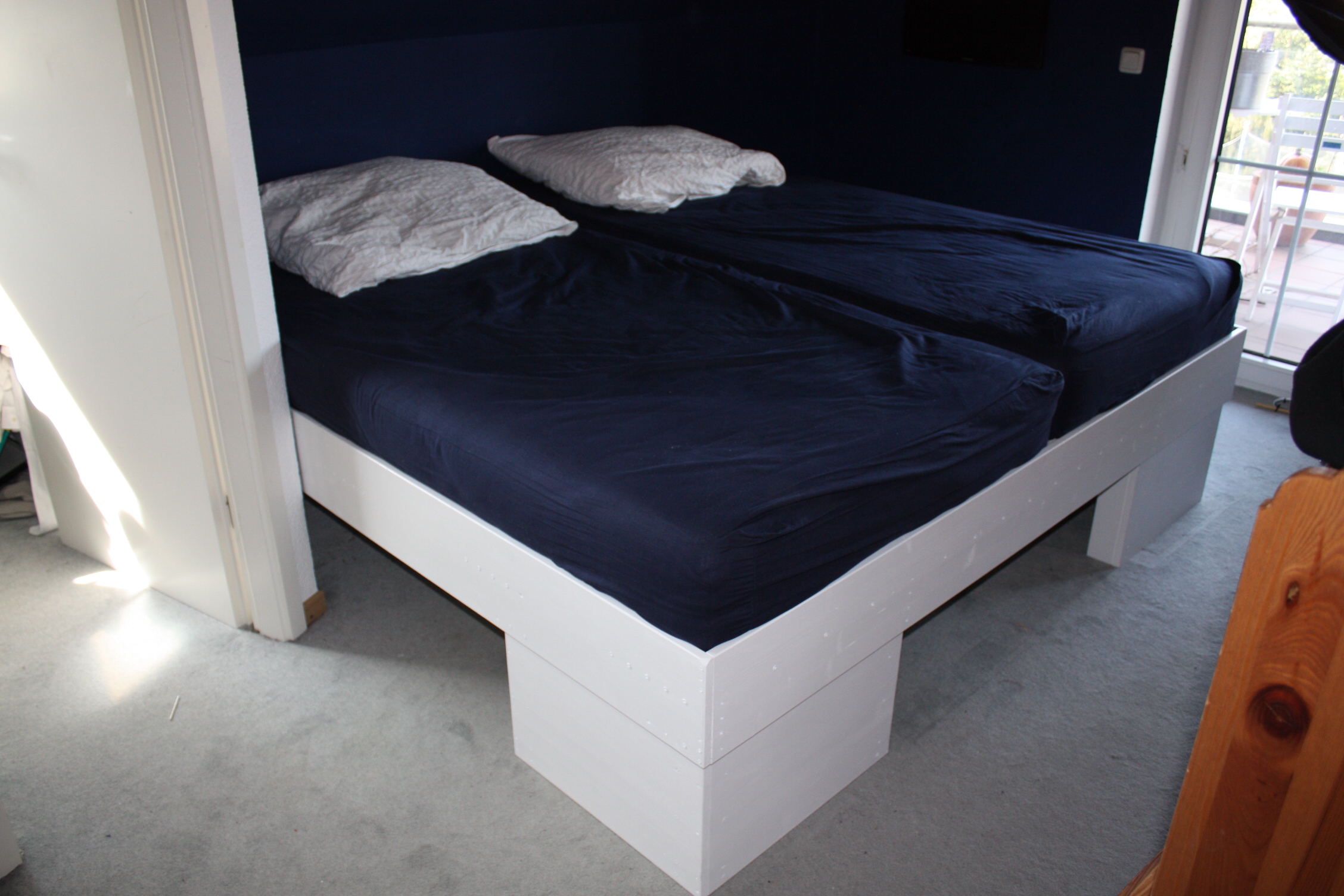 Die Latten werden dabei nicht gleichmäßig eingezogen, sondern entsprechend der Belastung: In der Mitte der jeweiligen Betthälfte und am Rand, wo man aus- und einsteigt, sind sie enger. Damit soll eine möglichst gute Belüftung der Matratze von unten gewährleistet werden. Das Zimmer hat eine Fußbodenheizung.