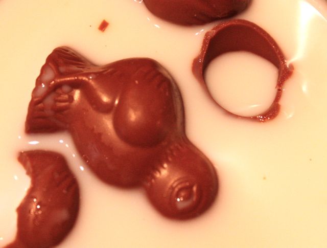 Die Herstellung ist denkbar einfach. In heißer Milch läßt man die zerbröselten Überreste des Hasen schmelzen. Auch Toffee oder Nougat macht sich sehr fein. Die Intensität und Süsse bestimmt man über die Menge der Schokolade. Eine kleine Warnung vorab: Die Brut wird durch solcherlei Kakao verdorben für jegliches Pulver.