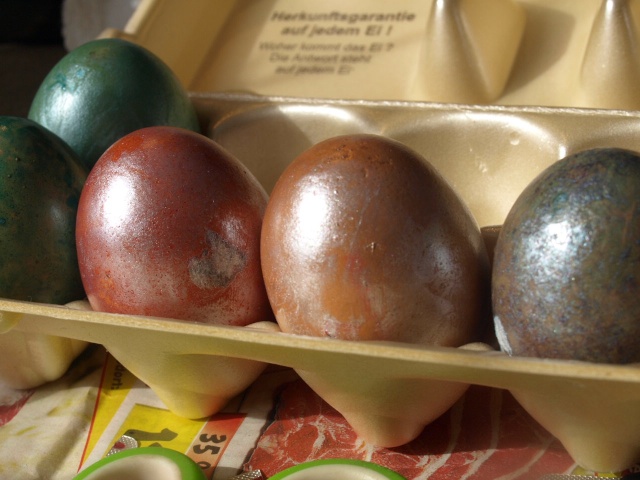 Kennt jemand noch das Bild? Ja, genau, das sind die Eier, die Teile meiner Osterdeko dargestellt haben. Und die haben über Ostern Kinder bekommen. Viele, viele bunte, gekochte Kinder. Und mit ihnen kam die alljährliche Frage: Was zum Geier macht man mit so vielen Eiern? Da ich wenig mehr hasse, als Essen wegzuwerfen, gibt es bei uns neben den üblichen Verdächtigen wie Eiersalat und Ei auf Brot noch diese Varianten hier: