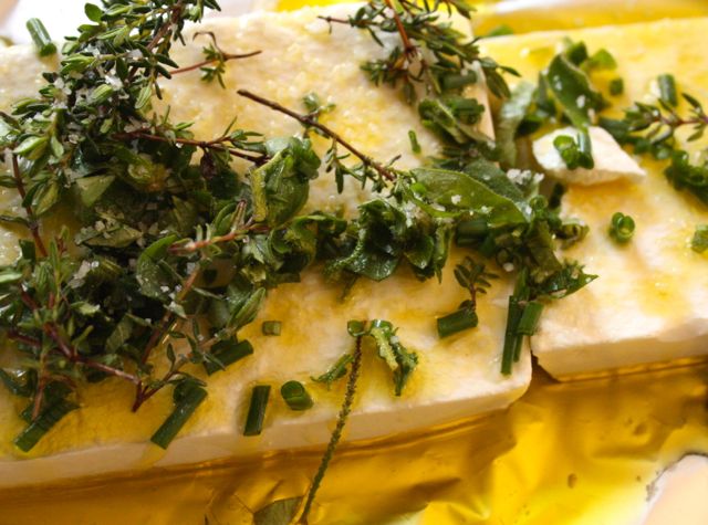 Dazu habe ich auf ein großes Stück Alufolie etwas Olivenöl gegeben. Darauf kommt ein nicht zu dünnes Stück Schafskäse – mindestens ein cm sollte die Scheibe schon haben, sonst pappt das ganze schnell an. Da drauf dann frische Kräuter aus dem Garten. Bei mir waren es verschiedene Tymiansorten, Estragon, Oregano, Petersilie und Schnittlauch. Darauf noch etwas Meersalz und einen Schuß Olivenöl drübergeben. Die Alufolie nach oben hin biegen und ganz oben leicht auf lassen. Dann für 10-15 Minuten auf den Grill legen. Vorsichtig danach das Päckchen runterheben, auf einen Teller geben und öffnen. Sehr lecker, wirklich!