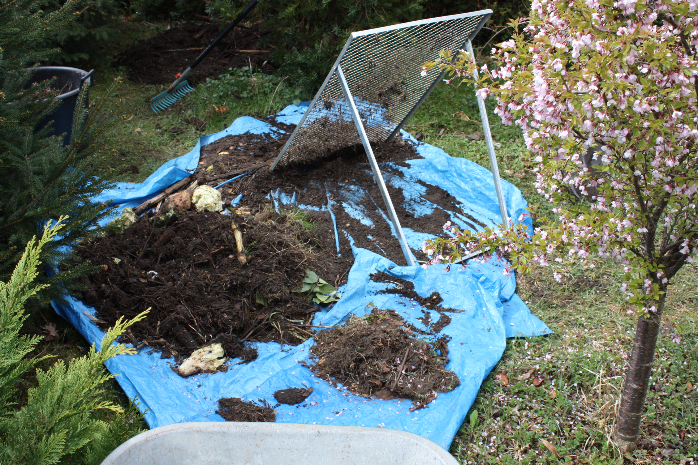 Gewinnung des Komposts. Die Rohmasse wird durch einen Sieb geworfen. Was hängenbleibt, wird später wieder in den Haufen getan. Kein Foto vom Strumpf, denn es ist ein familientaugliches Blog.