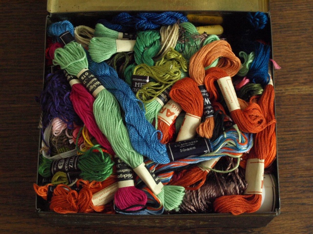 Nicht, dass man heute wirklich noch einen so aufwändigen Zirkelkasten brauchen würde, aber wegwerfen geht gar nicht, oder? Das Stickgarn dagegen kommt mir wie gerufen, sowas hat sich das Kind zum Geburtstag gewünscht. Jetzt ist es quasi ihr Geschenk von der verstorbenen Uroma. Die sich über das Interesse des „Häschens“ an Handarbeiten sehr gefreut hätte.