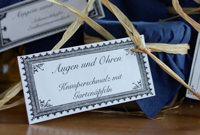 Für die etwas herzhaftere Fraktion dann eine Kräuterbutter aus 250gr Butter mit genug feinem Meersalz und so ungefähr allem, was ich im Garten an Kräuter finden und klitzeklein hacken konnte. Und da es ja auch ganz rustikale Gemüter gibt, noch etwas Schmalz mit Apfel und Zwiebel. Aus sehr klein gewürfeltem mageren, geräuchertem Speck (ja, ich weiß, alle anderen nehmen fetten, aber ich mag es aus magerem lieber) über eine halbe Stunde das Fett auslassen. Dann jeweils eine sehr klein gewürfelte Zwiebel und einen ebensolchen kleinen Apfel hineingeben. Mit einem Lorbeerblatt zusammen weitere 15 Minuten auf ganz kleiner Hitze schmurgeln. Zum Schluß einfach die Masse in ein Glas geben, minus dem Lorbeerblatt und der Hälfte der Speckgrieben.