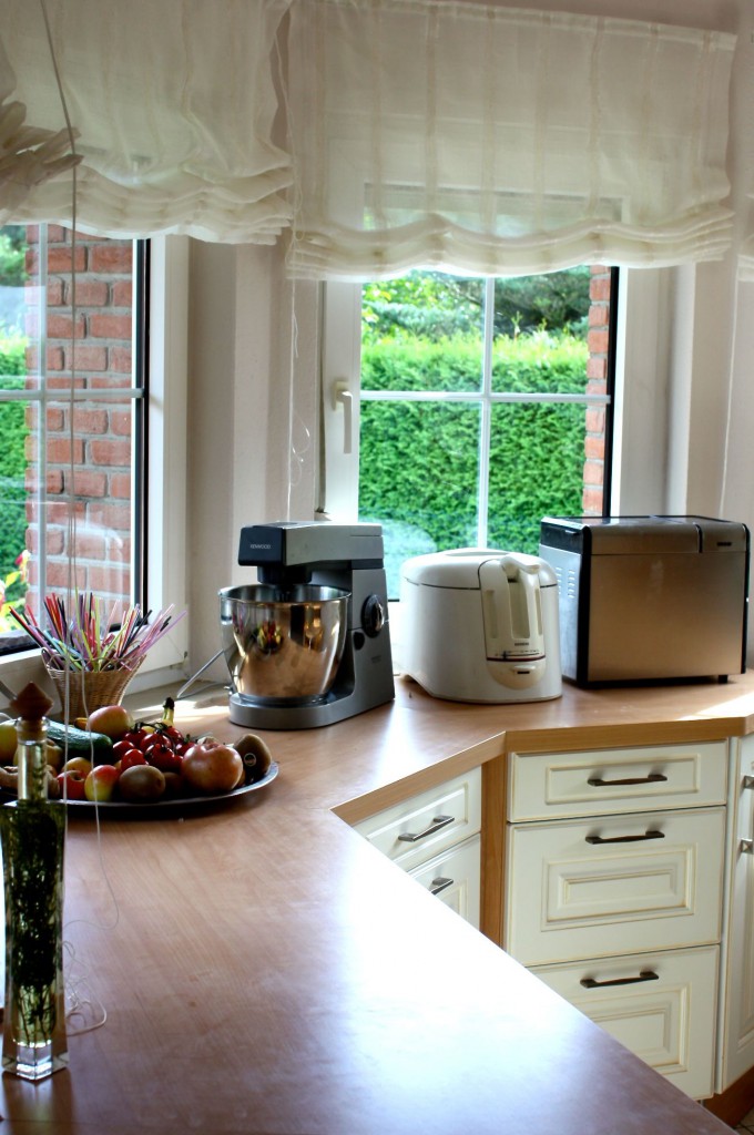 Mein Arsenal an den nötigsten elektronischen Geräten: Küchenmaschine, Brotbackautomat und Friteuse – und ja, ich brauche das Zeug mindestens einmal die Woche. Wobei die Küchenmaschine beinahe täglich in Gebrauch ist und die Brotmaschine alle zwei Tage. Und damit fange ich jetzt gleich auch an – damit die Küche nicht ewig so aufgeräumt bleibt, wie sie gerade ist.