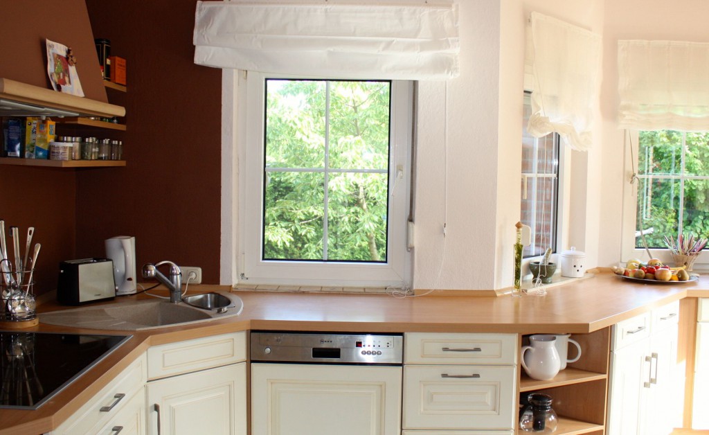 Die Küche müsste dringend gestrichen werden. Bloß gut, dass wir keine Mieter sind. In vielen Mietverträgen heisst es, die Küche müsse alle drei Jahre renoviert werden. Auch wenn der BGH festgestellt hat, dass viele Fristenregelungen zu starr sind: Wir sind auf jeden Fall dran. Bisher ist die Küche schlicht weiß gestrichen, oder war es zumindest mal. Lange Zeit konnte ich mir auch gar nicht vorstellen, eine andere Farbe auch nur in Betracht zu ziehen. So ganz langsam kommt das ins Wanken. Auch wenn Schokobraun oder Indigo immer noch draußen bleiben müssen, denke ich immerhin über eine Akzentwand in einem sanften, gedeckten Farbton nach. Ab und zu soll man ja seine Vorstellungen auf den Prüfstand stellen und mal gucken, ob man sich vielleicht weiter entwickelt hat. Außerdem kann man dann so schön mit dem Farbdesigner spielen.