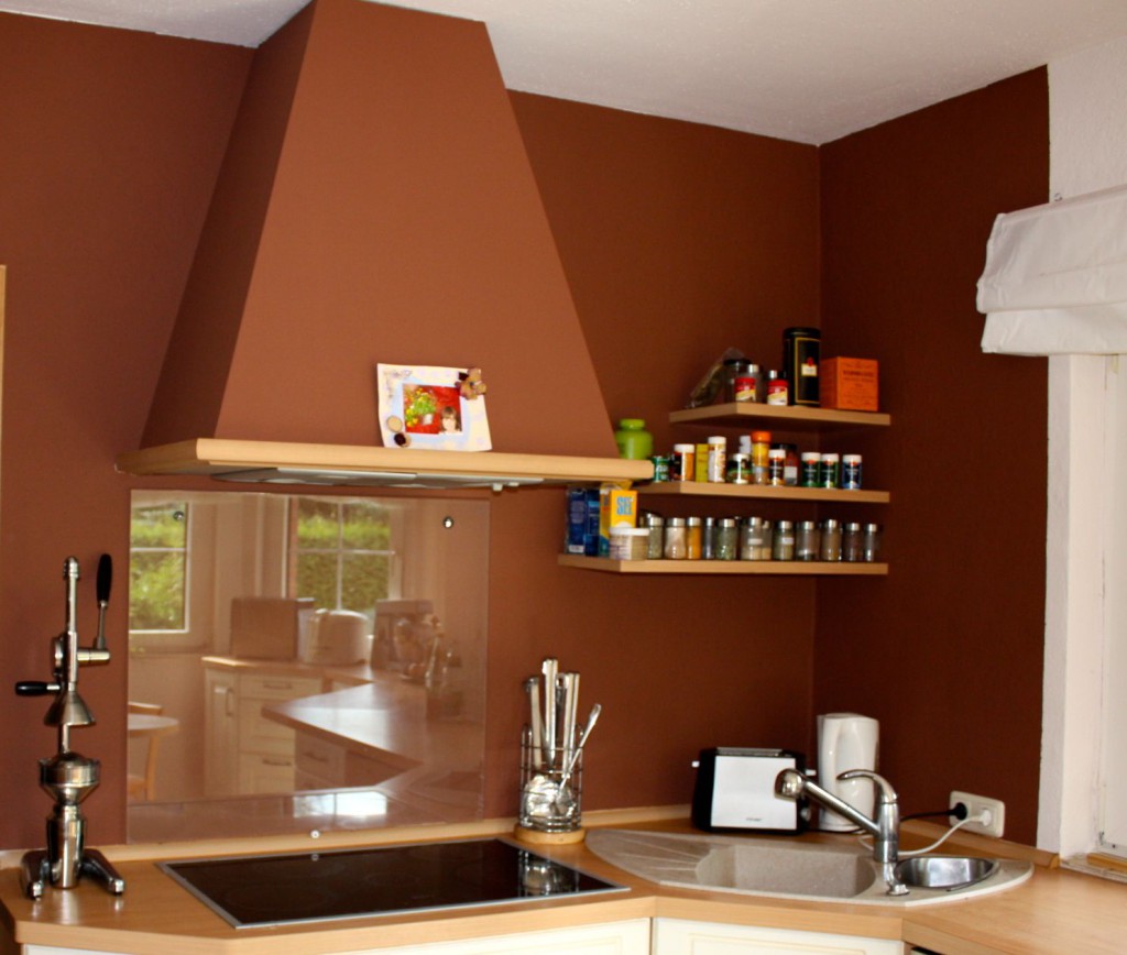 Alles, was jetzt braun ist, war beige. Das sah auch durchaus mal sehr gut aus. Leider ist dann die Dunstabzugshaube kaputt gegangen. Muss ich mehr sagen? Genau, das Beige war dann irgendwann eher ein dreckiges Schmutzweiß und der Grund, warum ich es nicht mehr sehen konnte und wir relativ Hals über Kopf renoviert haben. Übrigens nicht ganz ohne Probleme, unsere erste Version vom Braun betitelte Kind Nummer Eins als „Durchfallmäßig“ – womit sie nicht ganz unrecht hatte. Merke: Baumarktmitarbeiter sind auch samstagabends um 19:30 noch extrem freundlich und hilfreich, wenn man sie mit Süssigkeiten besticht ganz ohne Hintergedanken beschenkt.