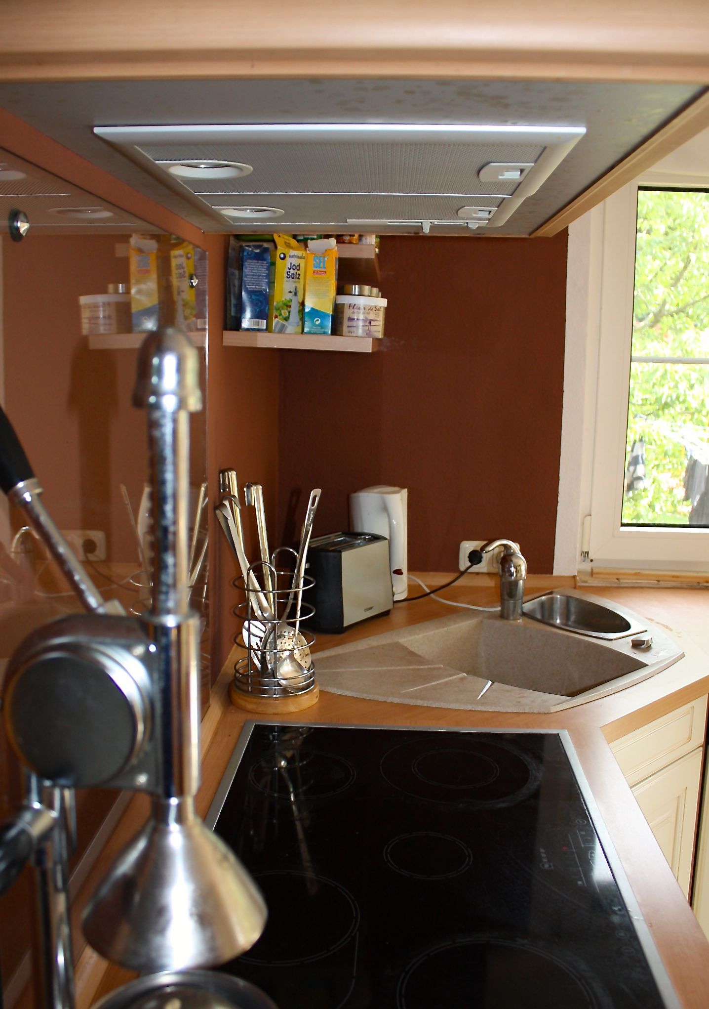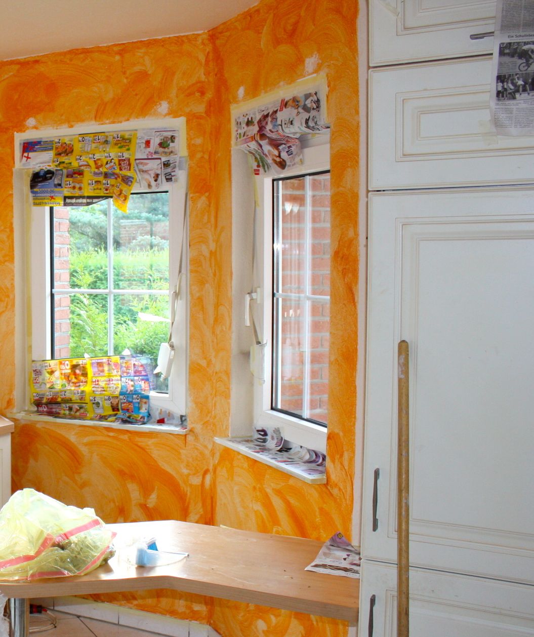 Vorher heißt, er war in einer damals sehr hippen Wischtechnik in einem noch hipperen Terracotta gestrichen, das aber eher an ein Orange erinnerte und dem Ganzen einen, nun, sehr individuellen Charme gab. An dem man sich schnell sattgesehen hatte (und zwar genau seit dem Zeitpunkt, an dem wir es gestrichen hatten und die Küchenbauer schon in der Tür standen, so dass keine Zeit mehr war, umzumalern).