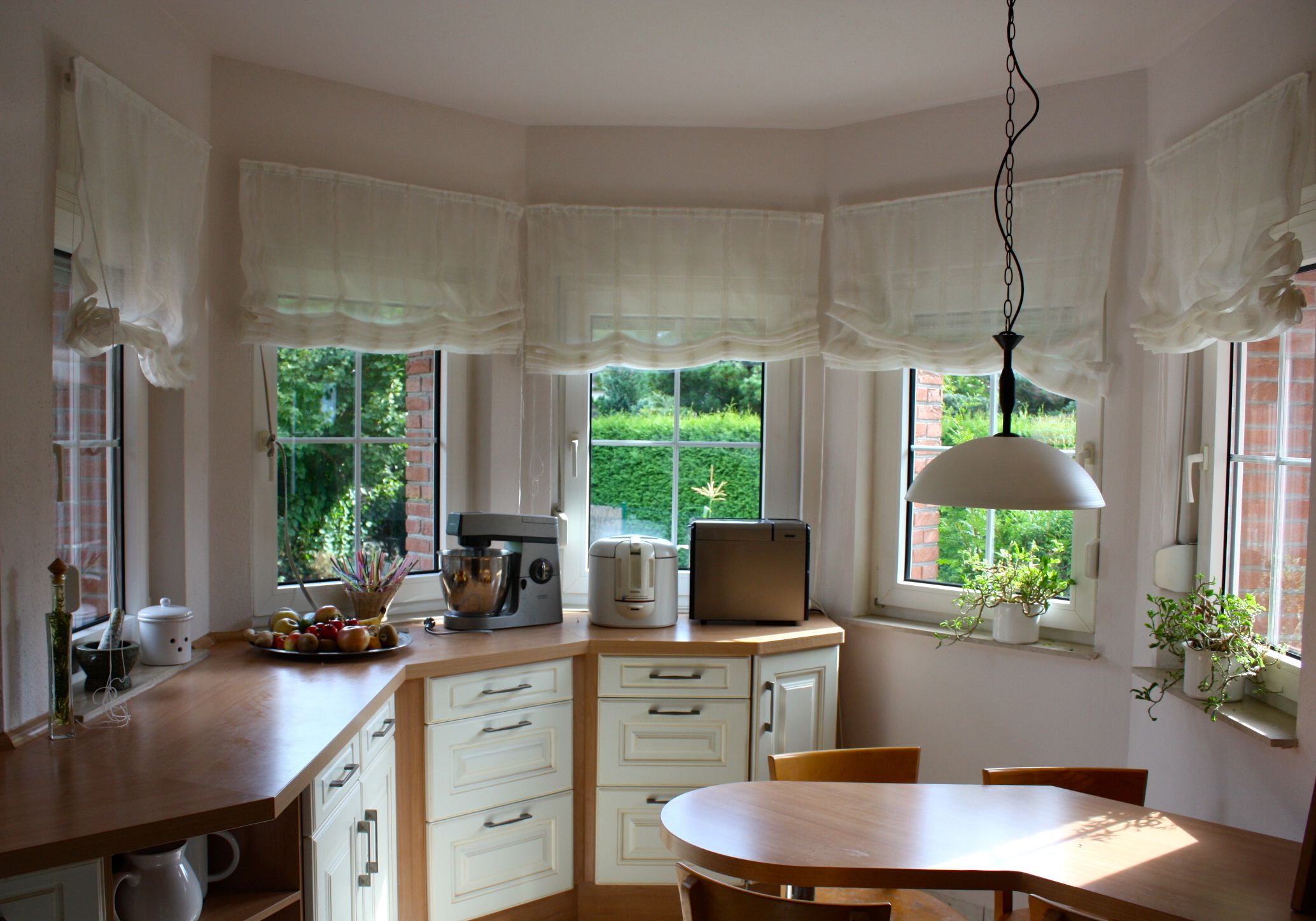 Das ist unser Erker heute, in einem Creme gestrichen und einer Hängelampe über dem Eßtisch statt dem Ungetüm von Strahler aus Edelstahl. Die Blumen sind noch aus der alten Küche. Ich hab zwar schöne weiße Orchideen gekauft, aber irgendwie bringe ich es nicht übers Herz diese beiden ausgesprochenen Häßlichkeiten von Pflanzen zu entsorgen.