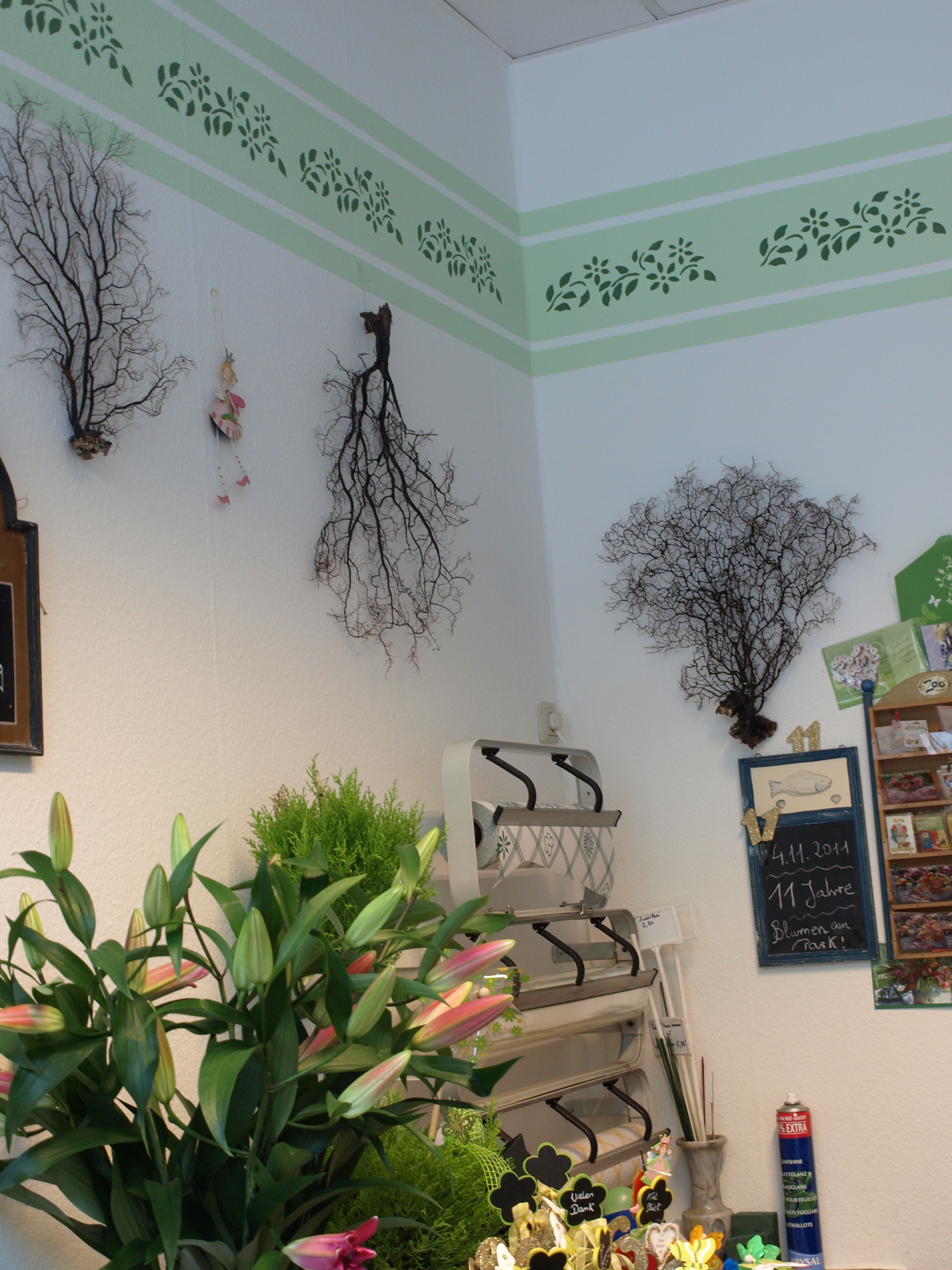 Was sie verändern würde, wenn sie könnte wie sie wollte? Renoviert hat sie gerade erst, seitdem ziert eine zarte grüne Bordüre die Wand. Es  gäbe schon sehr hochwertige Pflanzen, die sie schon gerne kaufen würde. Schöne Bonsai, die sich sehr gut im Fenster machen. Rosen mit meterlangem Stiel. Manchmal findet sie das reizvoll, aber in unserem sehr bodenständigen Kiez passt das nicht wirklich. Viele Familien mit Kindern, die es dann doch eher undramatisch mögen.