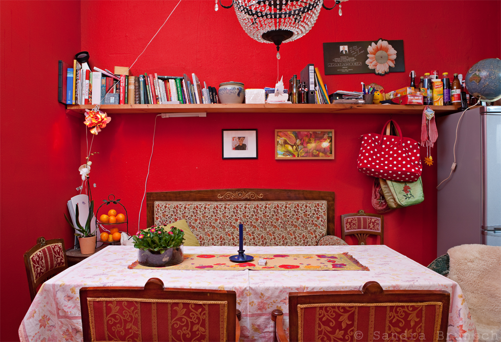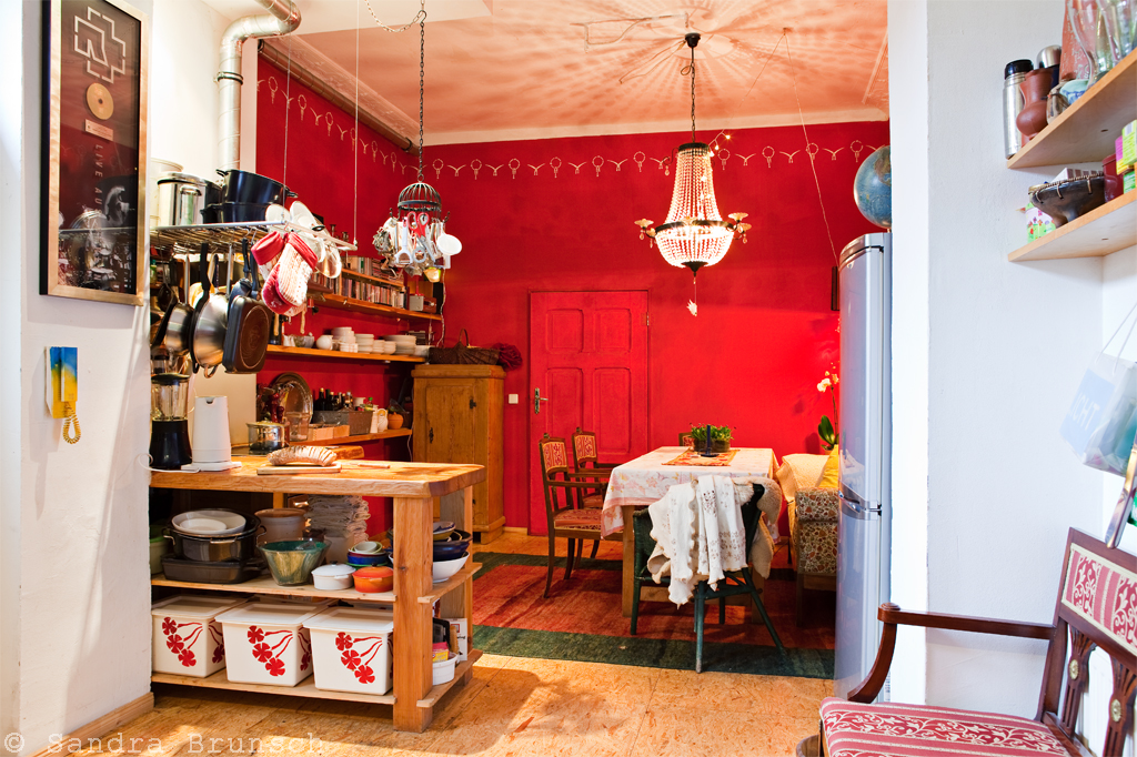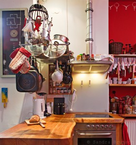 Gemütlich schon alleine wegen dem Sofa, man sitzt darauf wie Gott in Frankreich und will gar nicht mehr aufstehen. Und hat den Blich auf die Kochzeile. Von oben hängen Töpfe, alles steht in Reichweite und ich möchte bitte auch so eine „Naturarbeitsplatte“, die so wirkt, wie gerade aus dem Wald geholt und bearbeitet. Rot, nun ja, das ist offensichtlich, denke ich mal.