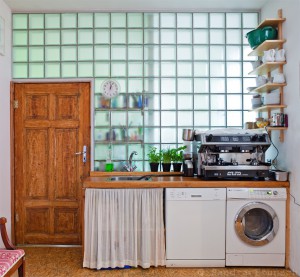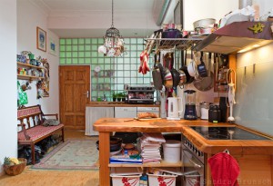 Hinter der Glaswand ist übrigens ein behinderten gerechtes Badezimmer, in dem im Winter auch gerne mal alles steht, was draussen keinen Frost abbekommen darf. Obwohl die Küche selbst kein Fenster hat, kommt durch die Glasbauwand sehr viel Licht durch und verhindert, dass sie dunkel wirkt.