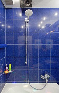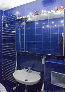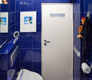 Diese beiden Bilder zusammengenommen ergeben in etwa die Breite des Bades –  und viel länger ist es auch nicht. Wenn man durch die Tür kommt, geht automatisch via Sensor das Licht  und meist ist auch Musik an. Das Licht ist im normal Falle weiß, kann aber auch in auf bunt getrimmt werden, was mit den Glitzerfliesen schon sehr diskomäßig rüberkommt – aber schon so aussergewöhnlich ist, dass man es einfach gut finden muss.