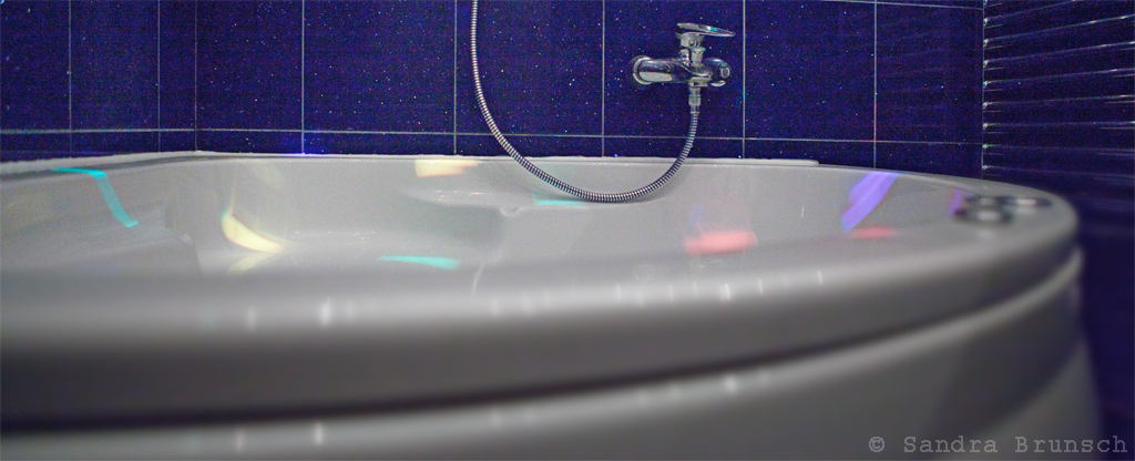 die Badewanne. Mit Whirl-Pool-von-allen-Seiten-Funktion. Und ja, den habe ich nebst Crémant bei einer sehr spontanen Poolparty auch schon ausprobieren dürfen und es ist ganz unglaublich wieviel Platz man in so einem kleinen Ding von Bad hat. Es ist sogar noch Platz für die wachsamen Augen der Sittenwächter (die übrigens, das möchte ich noch schnell betonen, ganz und gar nichts zu beanstanden hatten bei dieser Poolparty).