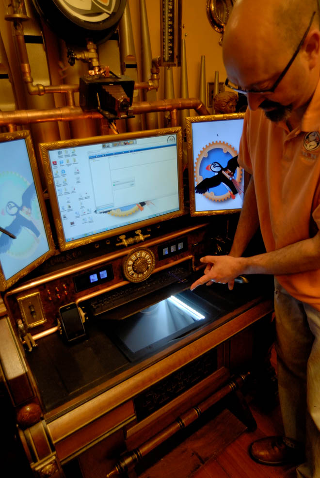 Aber Rosenbaums eigentliches Meister- und auch Lieblingsstück ist sein Computer- und damit Arbeitstisch. Er ist in eine alte Orgel von 1880 integriert. Ich meine, wie cool ist das Teil hier bitte???