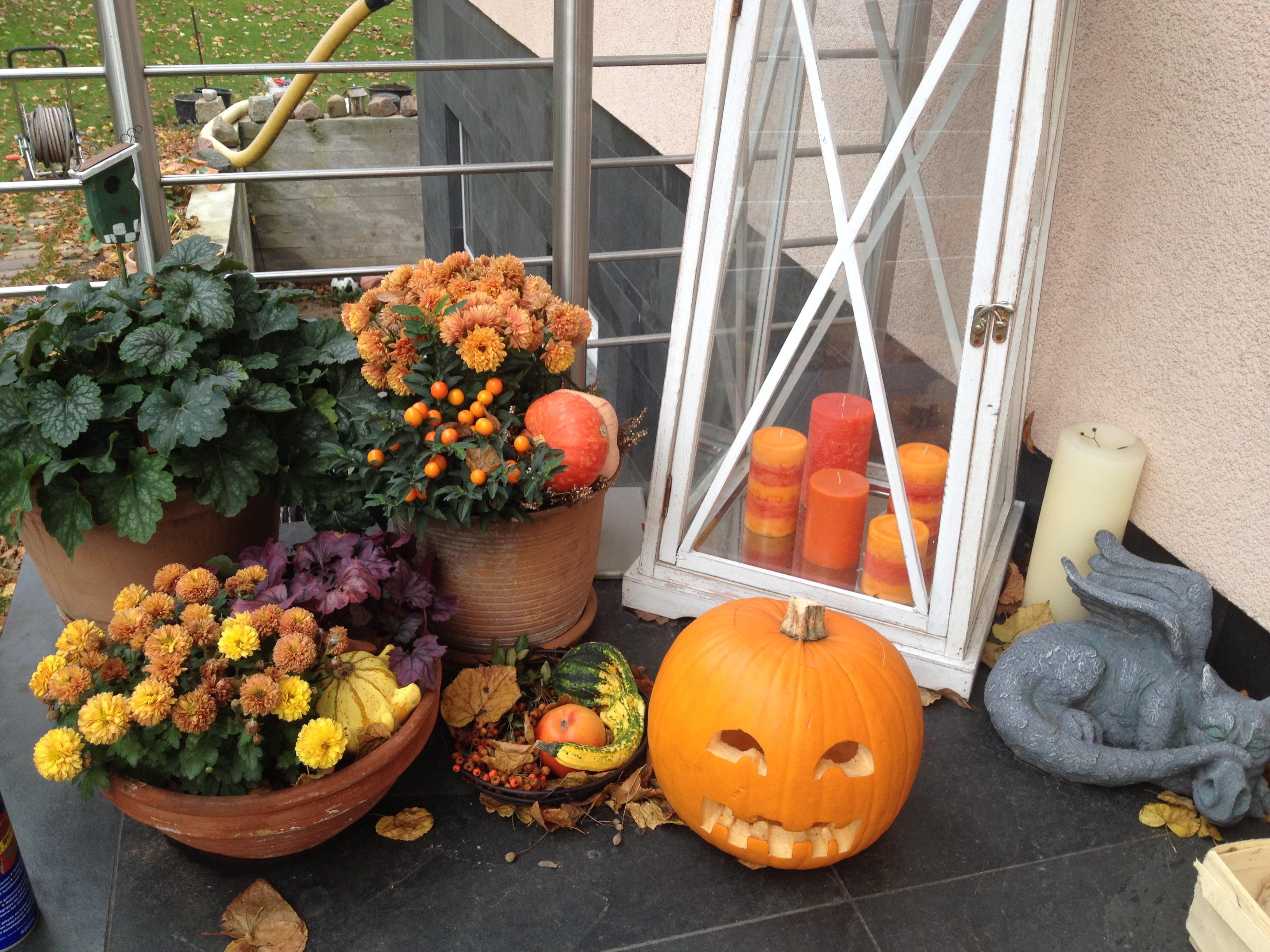 Dieses Jahr wird ein Schlangenkranz die Süssigkeiten sammelnden Kinder begrüßen. Er besteht aus einem ganz ordinären Kranz aus Weidenästen, in den ich kleine Gummischlangen aus dem Spielwarenhandel setzen werde. Und auf der Treppe werden ausgehöhlte, angebohrte Kürbisse stehen, aus denen ebensolche Viecher krabbeln.