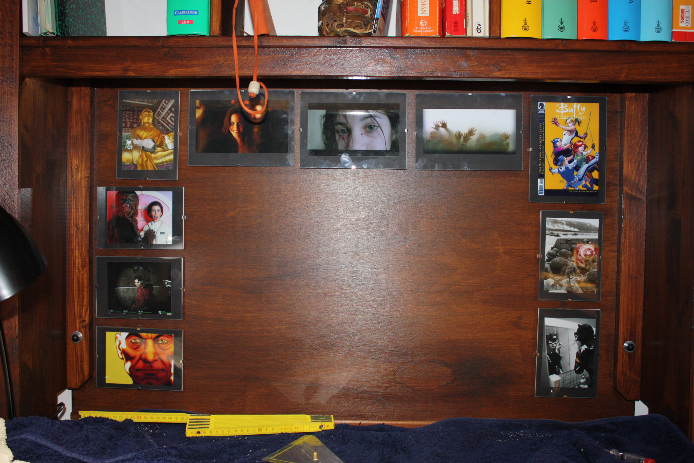 Nach einiger Überlegung habe ich beschlossen, die drei Seiten thematisch aufzuteilen — die Bilder von den Kindern gehören einfach nicht in die Nähe eines Game of Thrones-Screenshots. Rechts sind Familienbilder, in der Mitte um den Monitor Filme, und links diverser Kram. Hier wird früher oder später eh ein zweiter Monitor stehen.