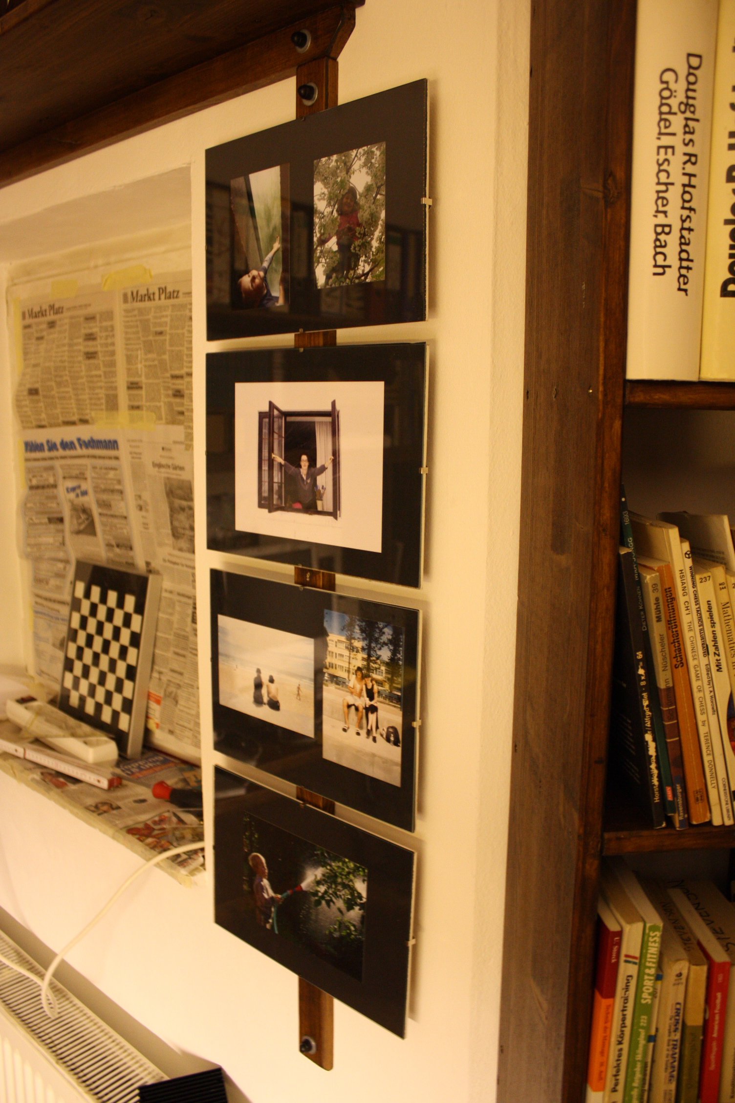 Das ist nicht der einzige Ort, wo wir Bilder aufhängen. Zwischen dem vorderen und mittleren Fenster montieren wir eine senkrechte Leiste und vier weitere „große“ Rahmen. Durch den Abstand zur Wand entsteht ein Schattenspiel. Das schafft mehr räumliche Tiefe als erwartet, und äh, passt ehrlich gesagt nicht wirklich an diese Stelle. Aber als Experiment ist es ein voller Erfolg. So könnte man eine ganze Wand bestücken.