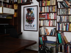 Schließlich haben wir zwischen dem Utility Table und den Nachtdienstregalen keine Regale gezogen, damit es nicht so eng ist, wenn man sich dort an den Sehr Großen Tisch setzt. An der Wand bleibt damit Platz für ein Poster. Wie bei allen Bildern im Zimmer ist die Auswahl des Motivs durch die ständige Anwesenheit von Kindern beschränkt. Ein Filmposter zu The Descent kommt da nicht in Frage. Nach einiger Suche fiel die Wahl auf einen Druck zu dem Computerspiel Portal 2, das die Kinder kennen.