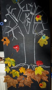 Letztens haben wir im Park Blätter gesammelt, die sollten eigentlich gepresst und aufgeklebt werden, aber nun ja, planen kann man viel. Jedenfalls lagen sie tagelang rum, bevor das erste den Weg an die Tafelwand fand. Das gefiel mir gut. Dann noch eins und noch eins und ich stellte mir vor, ein Baum an der Tafel und das Herbstlaub drumherum, das wär’s.