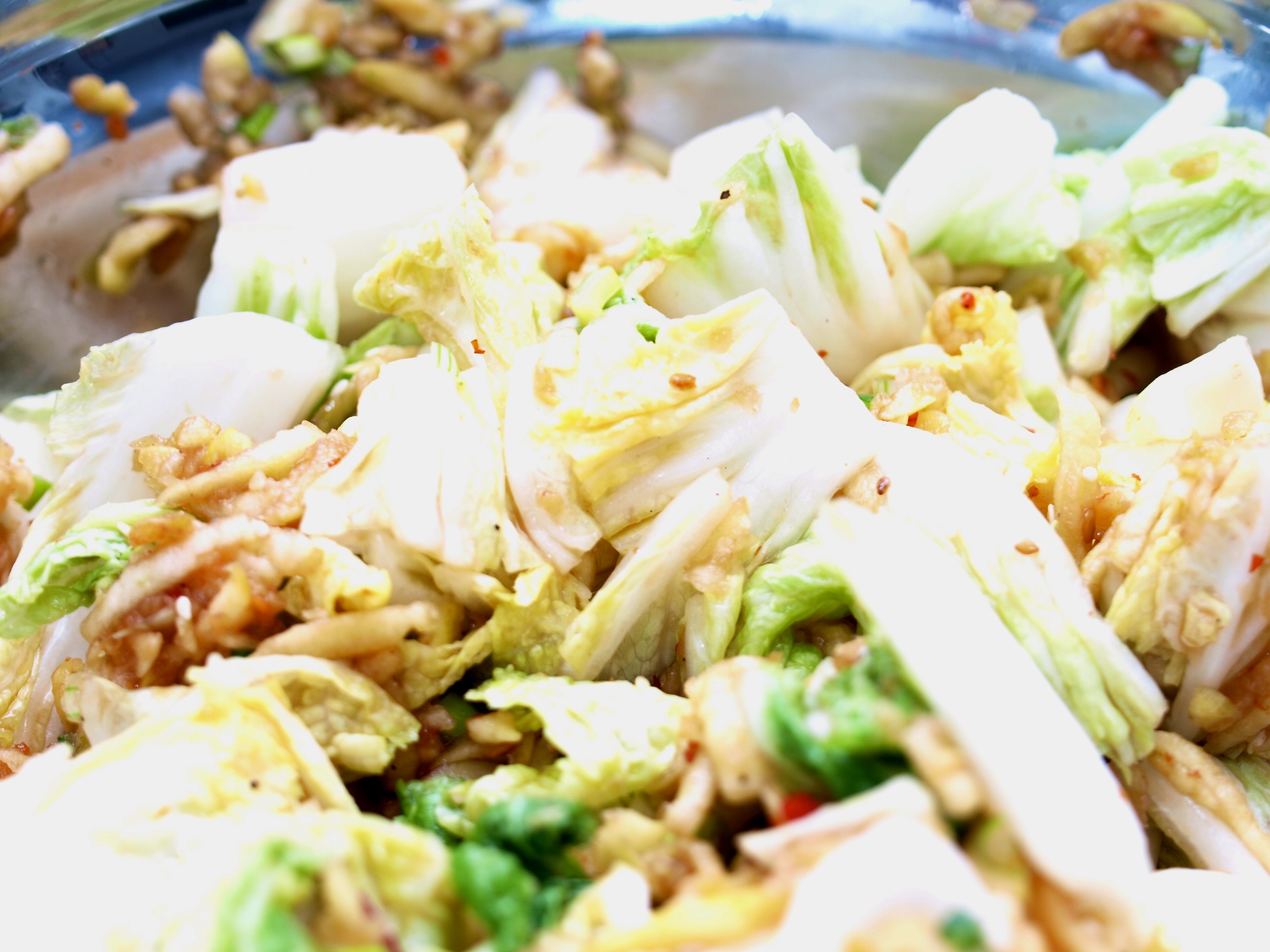 Dazu braucht man einen Kopf Chinakohl, aus dem man den Strunk entfernt, dann gründlich waschen, abtropfen lassen und in mundgerechte Stücke (ca. 5 cm) schneiden. Mit gut 2 Esslöffel Salz mischen und gut zwei Stunden beiseite stellen. Danach die entstandene Flüssigkeit abgießen, eventuell den Kohl etwas abspülen, um das Salz zu reduzieren.