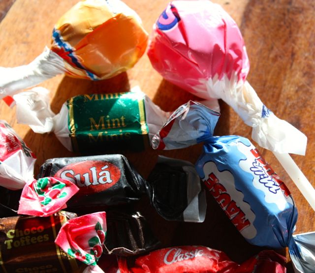 Alles, was man braucht sind ein altes Shirt und wahlweise eine Strumpfhose oder eine Leggins. Darauf werden dann mit Nadel und Faden jede Menge Bonbons, Gummibärchentüten und ähnlicher Süsskram genäht. Wenn man hat, kann man auch noch einen Hut oder ein Kopftuch verzieren.